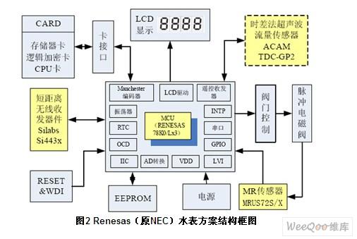 水表的電源一般由水表自行供給,這就對(duì)水表的功耗提出了苛刻的要求。國際規(guī)定,智能水表的靜態(tài)電流應(yīng)該小于30μA,實(shí)際中水表廠商都把該指標(biāo)控制在10μA以內(nèi)(使用干簧管傳感器時(shí)),保證工作時(shí)間大于6年以上才算合格。NEC帶LCD控制功能的8位微控制器以其低功耗、高性能等優(yōu)勢(shì),成為水表微控制器的優(yōu)質(zhì)選擇。 1 NEC山梨MR和Renesas MCU水表方案 該方案的工作原理為:在葉輪上裝上磁鐵,由磁場(chǎng)感應(yīng)器(MR Sensor)感知出葉輪的旋轉(zhuǎn)。磁場(chǎng)感應(yīng)器(MR Sensor)把磁場(chǎng)信號(hào)轉(zhuǎn)變成電信號(hào),再由單片機(jī)進(jìn)行計(jì)量的加法或減法運(yùn)算,運(yùn)算值由液晶顯示或?qū)ν獠枯敵。如圖1所示